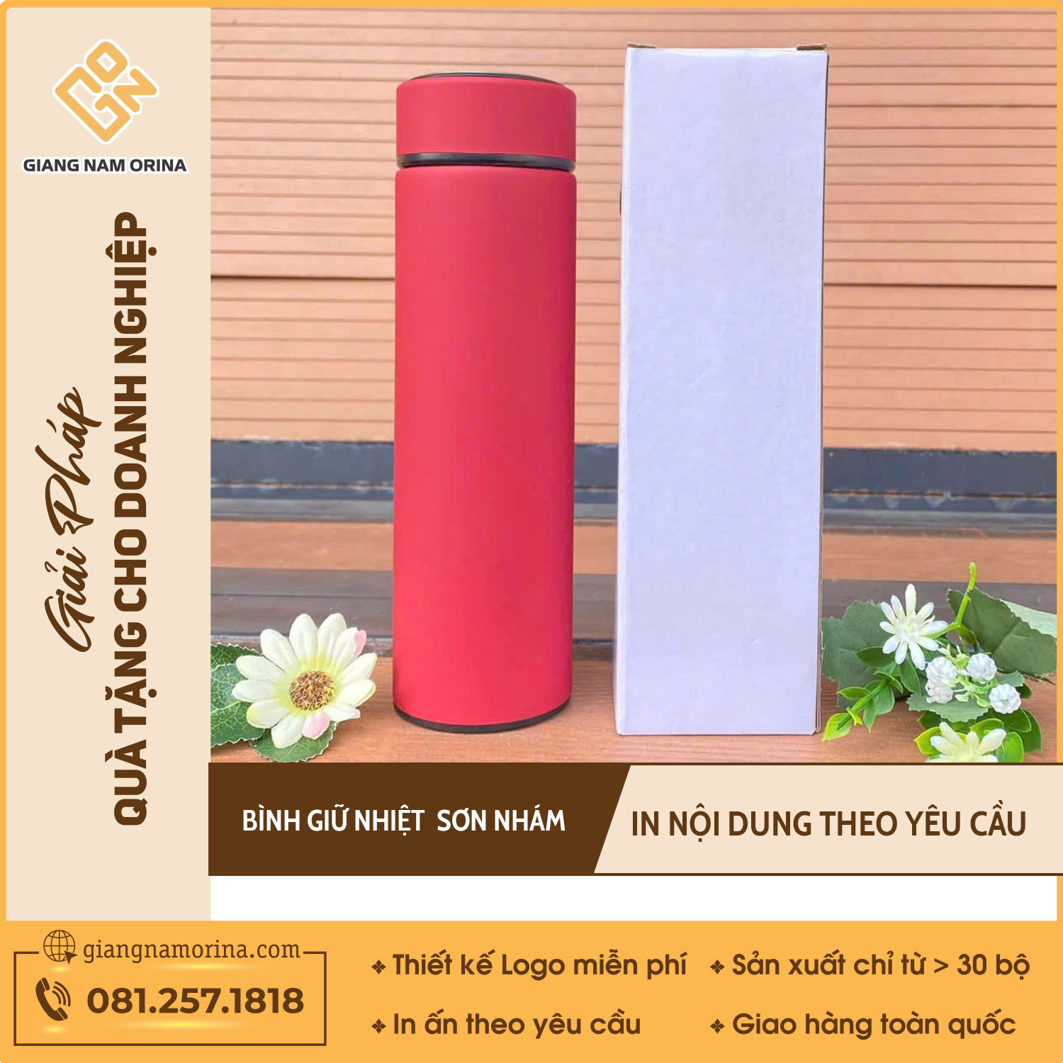 Giang Nam Orina cam kết mang đến những chiếc bình giữ nhiệt chất lượng cao, giá cả phải chăng cùng dịch vụ chuyên nghiệp. Với kinh nghiệm nhiều năm trong lĩnh vực quà tặng doanh nghiệp, chúng tôi luôn cung cấp sản phẩm đạt chuẩn chất lượng, nguồn gốc rõ ràng, bảo hành lên đến 12 tháng. Hãy để Giang Nam Orina đồng hành cùng doanh nghiệp bạn trong chiến lược quảng bá thương hiệu hiệu quả.