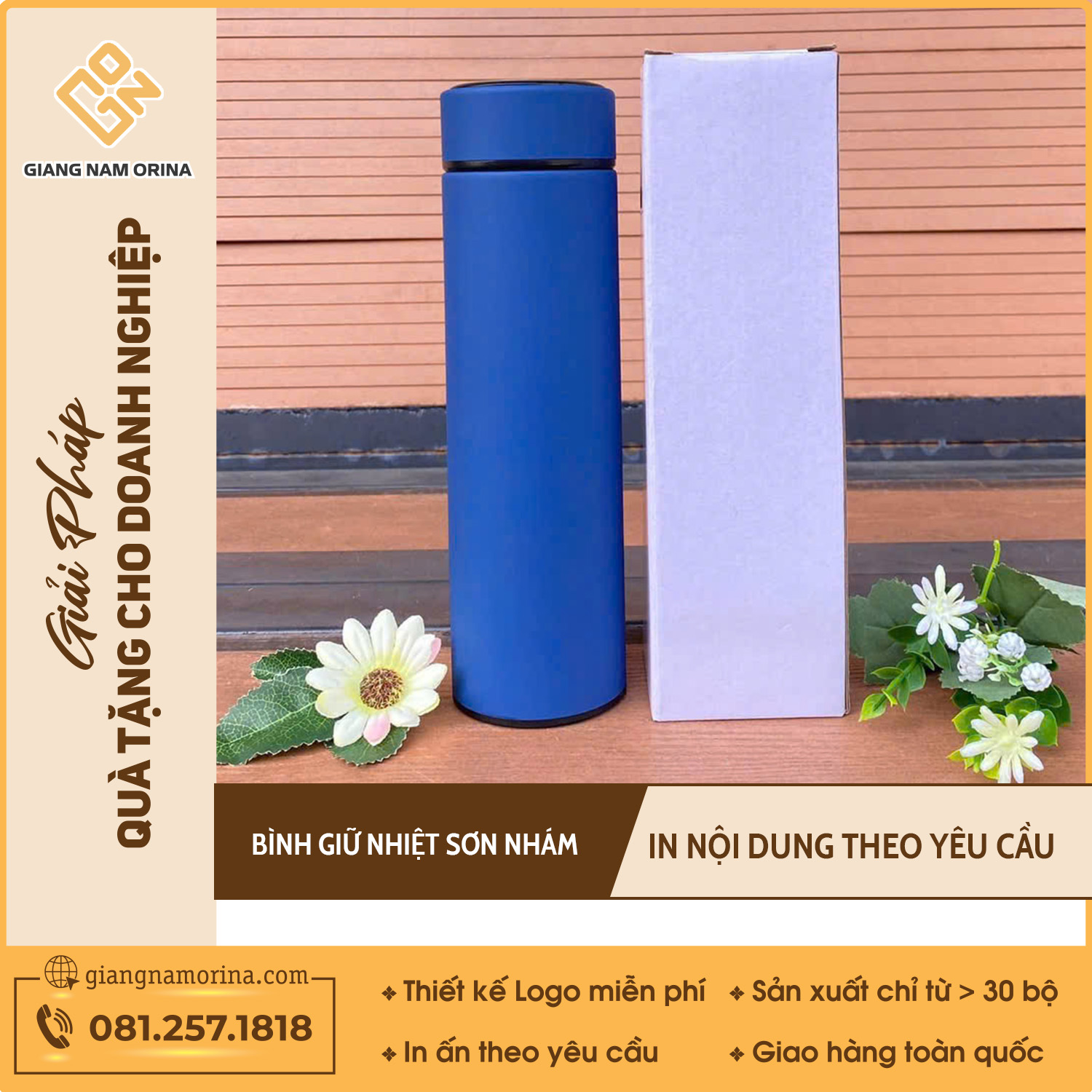 Giang Nam Orina cam kết mang đến những chiếc bình giữ nhiệt chất lượng cao, giá cả phải chăng cùng dịch vụ chuyên nghiệp. Với kinh nghiệm nhiều năm trong lĩnh vực quà tặng doanh nghiệp, chúng tôi luôn cung cấp sản phẩm đạt chuẩn chất lượng, nguồn gốc rõ ràng, bảo hành lên đến 12 tháng. Hãy để Giang Nam Orina đồng hành cùng doanh nghiệp bạn trong chiến lược quảng bá thương hiệu hiệu quả.