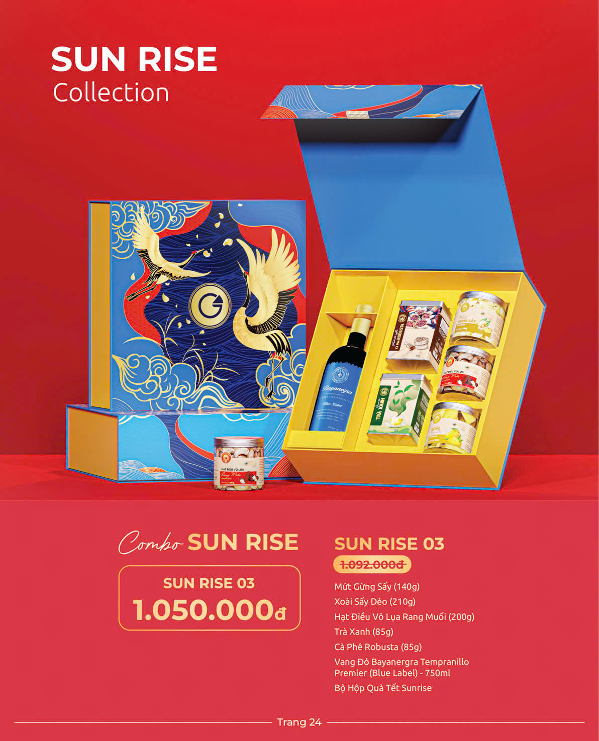 Sunrise 03 là sự kết hợp hài hòa giữa đồ uống, mứt Tết truyền thống, trái cây sấy hiện đại và rượu vang cao cấp – mang đến trải nghiệm thưởng thức đa tầng, phù hợp với nhiều đối tượng.