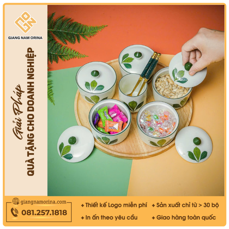Giang Nam Orina tự hào là xưởng cung cấp quà tặng gốm sứ cao cấp hàng đầu Việt Nam. Chúng tôi chuyên sản xuất – in logo – thiết kế quà tặng doanh nghiệp như khay mứt Tết, ly sứ, bình giữ nhiệt, ấm chén Bát Tràng… với giá xưởng cạnh tranh và chất lượng đảm bảo.
