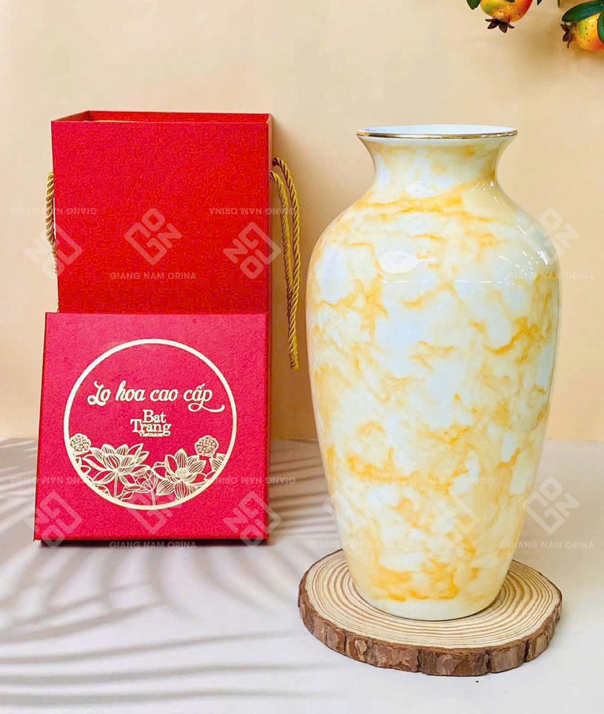 Lọ hoa gốm sứ trắng vân đá vàng kem gây ấn tượng với sự kết hợp hài hòa giữa nền trắng tinh khôi và những đường vân đá màu vàng kem nhẹ nhàng. Hiệu ứng vân tự nhiên mang lại cảm giác sang trọng, tinh tế nhưng không quá phô trương, phù hợp với nhiều phong cách trang trí từ hiện đại đến tối giản.