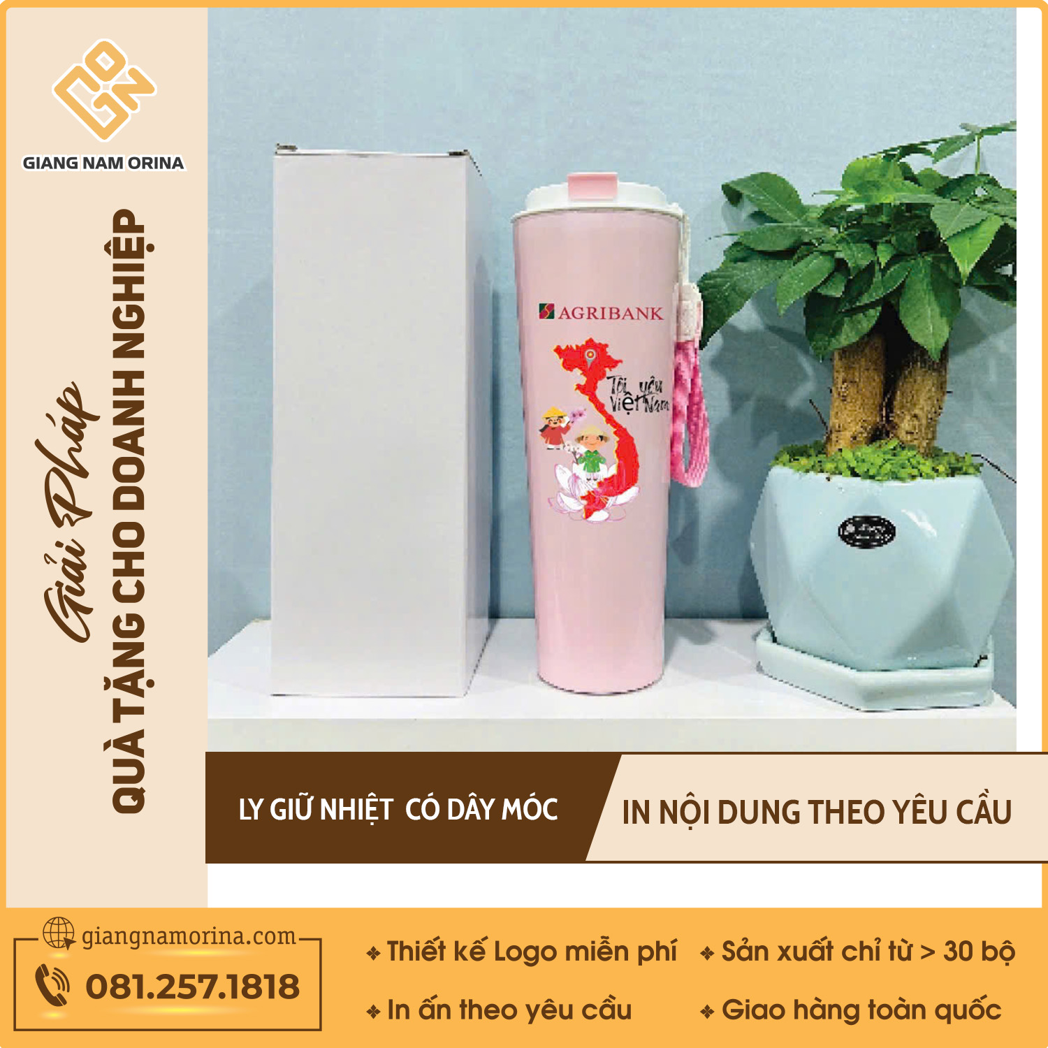 Giang Nam Orina cam kết mang đến những chiếc bình giữ nhiệt chất lượng cao, giá cả phải chăng cùng dịch vụ chuyên nghiệp. Với kinh nghiệm nhiều năm trong lĩnh vực quà tặng doanh nghiệp, chúng tôi luôn cung cấp sản phẩm đạt chuẩn chất lượng, nguồn gốc rõ ràng, bảo hành lên đến 12 tháng. Hãy để Giang Nam Orina đồng hành cùng doanh nghiệp bạn trong chiến lược quảng bá thương hiệu hiệu quả.
